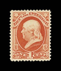 1108 nh O102 image#O102, 15c Interior, on soft porous paper, pristine mint single, prooflike color and impression on crisp paper, unblemished o.g., never hinged, nearly very fine; photocopy of a 1995 PSE certificate for a block of four, this being the top left stamp. (Image) $350.00