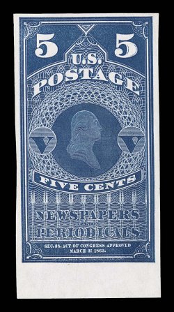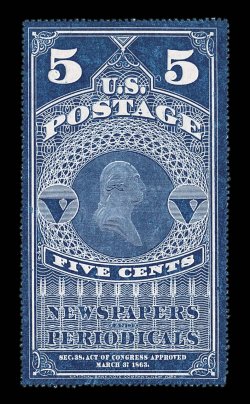 1110 og PR1 image#PR1, 5c Dark blue, without gum as issued, unusually well centered, wonderfully bright and fresh, extremely fine; seldom encountered in this premium condition; 2004 PF certificate. (Image) $525.00