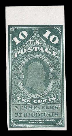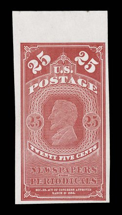 1114 og PR40 image#PR40, 12c Rose special printing, without gum as issued, an incredibly choice example of this very scarce stamp, being in far superior quality to the vast majority of known copies, wonderfully well centered amid uncharacteristically large margins, strong fresh color and impression on bright paper, even its perforations are unusually intact for a special printing, extremely fine; only 1,313 issued; ex-Ballman. (Image) $1,350.00