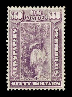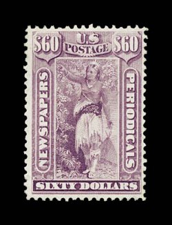 1112 og PR32 image#PR32, $60.00 violet, a gem mint example of this very rare and seldom offered high value Continental Bank Note newspaper stamp, being not only one of the very few sound mint examples in existence which still retains its full original gum, but this is, in all likelihood, the finest available of this small existing population, bright fresh color and a razor-sharp impression on crisp paper, possessing outstanding centering and margins unlike any other we have ever offered, full clean o.g., very lightly hinged, extremely fine; the perfect stamp for the determined collector who seeks out only the finest quality newspaper stamps available; 1976 and 2004 PF certificates. (Image) $5,250.00