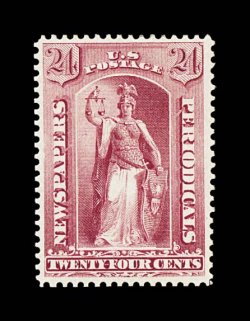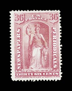 1119 og PR65 imagePR65, 36c Red, attractive mint example of this scarce newspaper stamp, unusually fresh with gorgeous rich color and a crisp impression, well centered, full o.g., relatively lightly hinged, very fine; photocopy of a 2004 for a block of three, this being the top left stamp. (Image) $750.00