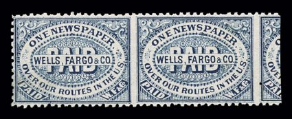 1148 og 143LP9b image#143LP9b, Wells Fargo & Co. Blue newspaper stamp, imperforate vertically, horizontal pair, with a portion of a third stamp at right, exceptionally fresh, with beautifully rich color and a crisp impression, well centered as well, pristine o.g. with just a faint trace of hinging, very fine; a very scarce and undervalued error; 2003 PF certificate. (Image) $350.00