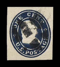 1151 O W25 image#W25, 1c Blue on manila wrapper, star die, used cut square, balanced 24x27mm, black cut-cork cancel, fresh and very fine; while UPSS lists three different varieties of this as a full wrapper, all are major rarities and even used cut squares are exceptionally elusive in any condition; signed Richard Champagne. (Image) $2,000.00