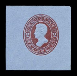 1158 og U146 image#U146, 2c Vermilion on blue, gem cut square, being a full corner measuring 46x45mm, deep intense color with razor-sharp embossing, neatly complemented by the fresh blue paper, extremely fine. (Image) $140.00