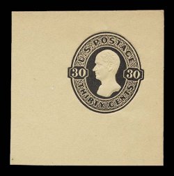 1159 og U210 image#U210, 30c Black on amber manila, impressive mint cut square, being a full corner measuring an extravagant 53x53mm, an especially crisp and well embossed example, fresh paper, extremely fine. (Image) $175.00