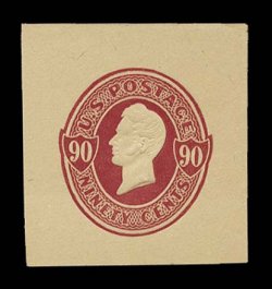 1160 og U217 image#U217, 90c Carmine on amber manila, select mint cut square, full corner measuring 38x41mm, fresh with rich color and strong embossing on bright amber manila paper, extremely fine. (Image) $150.00