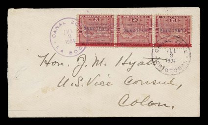 1205 c 1 image#1, 2c Rose, horizontal strip of three, bright color, tied to cover by magenta "Canal Zone/La Boca/Jul 2 1904" c.d.s., and similar Cristobal c.d.s. of the same date, cover with small fault at far left not affecting stamps or markings, a very fine first issue cover; signed J. C. Perry. (Image) $1,500.00