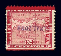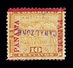 1220 og 11b image#11b, 2c Rose, "Panama" overprints inverted, bar at bottom, fresh mint single, quite well centered, brilliant color and surrounded by full even perforations, full o.g., mostly undisturbed and lightly hinged, very fine; the number issued is put at 200, however Plass notes that only 35 examples have been recorded; a rare and elusive error that is grossly undercataloged. (Image) $375.00