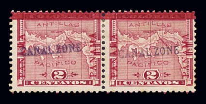 1208 og 1, 1b image#1b, 2c Rose, double "Canal Zone" overprint, variety is left stamp in a horizontal mint pair, one strike is strong and a second complete strike is light and displaced about 1mm to the left, fresh with rich color, full o.g., light h.r., centered a bit to the top right, still a very fine example of this rare overprint error; this example illustrates how this variety legitimately came about, being a handstamp the overprinting device had to be re-inked, the diversity in intensity of the impressions on this issue indicate that the overprint was applied to several stamps before being re-inked, in this case one too many impressions was made and the first impression applied to this stamp was considered too light (the other stamp in this pair evidences this because it is light also), thus the canceller was re-inked and applied again, the clerk trying to apply it over the first impression so that it would not be noticed, Plass indicates that only four examples have been documented. (Image) $3,050.00