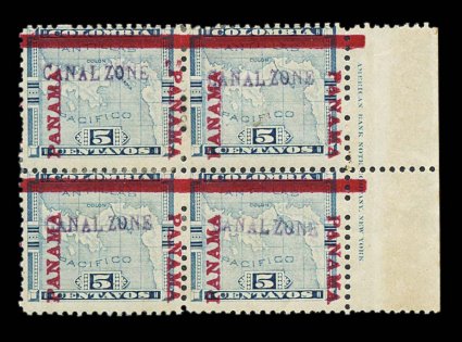 1210 ogbl 2 var. image#2 var., 5c Blue, colon between right "PANAMA" and bar, the variety being the top left stamp in a right margin imprint block of four (positions 49-50/59-60), part o.g., fine; a very scarce variety, with only 156 examples printed, and quite desirable in this block format confirming the position; each signed J.C. Perry. (Image) $1,275.00+