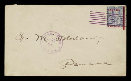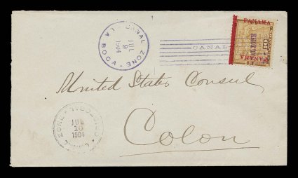 1214 c 3 var. image#3 var., 10c Yellow, colon between right "Panama and bar, position 10, centered to the bottom left, tied to cover to Colon by straight line cancel with matching "Canal Zone/La Boca/Jul 12 1904" c.d.s. at left, similar Cristobal transit, all markings on the front, horizontal folds at the bottom of the cover, fine; exceptionally rare, especially on cover, as this variety is found in two positions in the sheet though apparently not all stamps from these positions show this spacer bar which is very clear on this example, Plass records only nine copies, four unused and five mint making no mention of a cover. (Image) $550.00+
