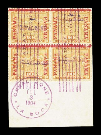 1212 Obl 3 image#3, 10c Yellow, used block of four, tied to piece by magenta July 3, 1904 La Boca c.d.s and straight line cancel, nicely centered, very fine; a rare and attractive block; 1968 PF certificate. (Image) $1,150.00