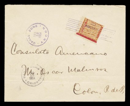 1211 c 2a image#2a, 5c Blue, inverted "Canal Zone" overprint, strong rich color, pulled perf. at left, tied to cover by magenta straight line cancel, with matching "Canal Zone/Ancon/Jul 9 1904" c.d.s. fine and very scarce on cover. (Image) $800.00