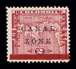 1207 og 1a var. image#1a var., 2c Rose, inverted "Canal Zone" overprint, position 96 from the bottom of the sheet, having the additional variety of "Panama" 14 3/4 to 15mm long, natural s.e. at bottom, quite well centered, strong color, slightly disturbed o.g., light h.r., two tiny thin spots, otherwise very fine; only one sheet of 100 of the inverted overprints was issued and since this "Panama" variety occurs on only six positions in the sheet, only six examples could have been printed with this combination of varieties and half of those come from the bottom row having natural straight edges as does this example; signed J.C. Perry (CZSG #1a.1b). (Image) $950.00+