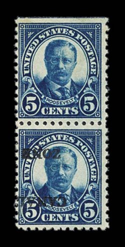 1242 og 86g image#86g, 5c Dark blue, vertical pair, one without overprint, other with inverted overprint, with natural straight-edge as top as all are known examples since this error only came from the top row of one sheet, deep color, usual centering, o.g., lightly hinged, fine; one of the key errors of this issue, as only ten examples were ever produced. (Image) $2,250.00