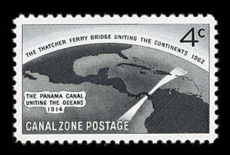 1243 nh 157a image#157a, 4c Black, Thatcher Ferry Bridge omitted, position 24, a gorgeous mint example of this, one of the most famous printing errors in philately, perfectly centered within large margins, brilliantly fresh, o.g., n.h., an extremely fine gem; one full sheet of 200 (which was cut into four panes of 50) was inadvertently printed without the silver bridge, only one of these panes of 50 ever made it into the public's hands, in this case the famous stamp dealer H.E. Harris, who successfully sued the Canal Zone Postal Administration preventing them from deliberately printing tens of thousands of similar errors (much like the famous U.S. Dag Hammaeskjold error), of the three panes that never made it into the public's hands, one pane of 50 each were laminated and donated to the Smithsonian Institution and the Canal Zone government, while the third pane was destroyed, leaving 50 stamps for the collecting public; this is position 24 (as indicated by a small light pencil position number on the reverse of the stamp) and is accompanied by a 1988 PF certificate. (Image) $7,500.00