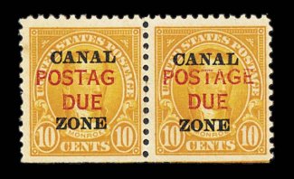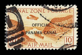 1241 og 56b image#56b, 2c Orange vermilion and black, "Canal Zone" double, one reading down, brilliantly fresh colors, centered to the bottom as always, o.g., small thin, fine appearance; only 100 were printed. (Image) $650.00