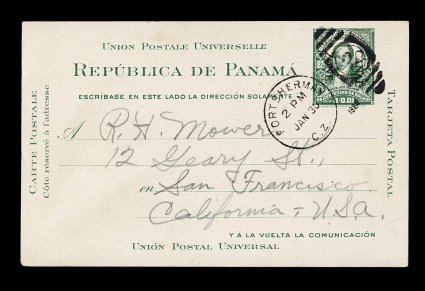 1250 Oc UX5 image#UX5, 1c Green postal card, tied by "Fort Sherman C.Z./Jan 30/1924" duplex postmark, sent to San Francisco, very fine. (Image) $450.00