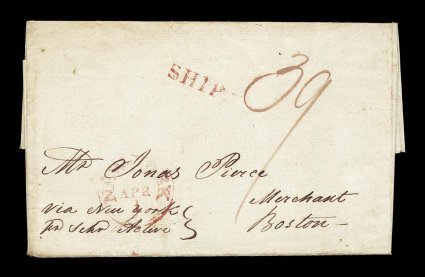 1257 c image1820 Puerto Rico "Ship" cover, red straight line hs. on very early prestamp entire folded letter to Boston regarding a shipment of potatoes, inscribed "Via New York/per Schr. Active", matching red "New York/Apr. 1" c.d.s., ms. "39" rate marking, very fine; this early cover is shortly after Puerto Rico started having direct commerce with non-Spanish countries. (Image) Est. 150-200
