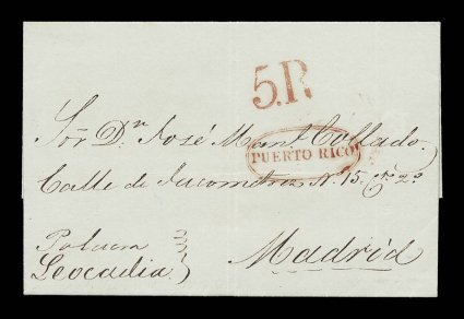 1258 c image"Puerto Rico" in oval handstamp, choice and unusually clear strike of this scarce marking on fresh and very attractive 1841 entire folded letter to Madrid, equally choice "5.R" rate hs., Madrid receiving c.d.s. on the reverse, extremely fine. (Image) Est. 150-200