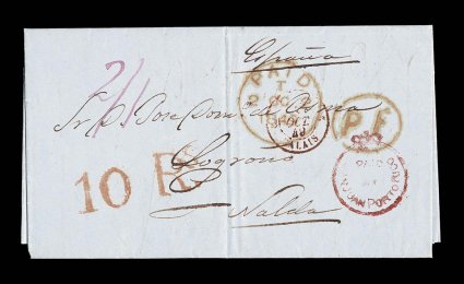 1259 c S.G. #CC1 imageS.G. #CC1, Red "Paid at/San Juan Porto Rico" Crowned Circle, quite complete and clear strike of this British paid marking on 1849 entire folded letter to Logrono, Spain, on reverse is black "San-Juan-Porto-Rico/SP 10/1849" double-arc British c.d.s., bold large "10Rs." rate hs. with no other Puerto Rican post office markings, London transit and "PF" in oval plus "2/1" ms. British rate marking , via France and backstamped Logrono very fine with overall clear and attractive markings (S.G. £600). (Image) Est. 400-500