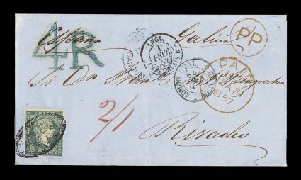 1260 c S.G. #CC1 imageS.G. #CC1, Black "Paid at/San Juan Porto Rico" Crowned Circle, quite clear and complete strike on folded cover to Rivadeo, Spain, in combination franking with Cuba 1/2r Greenish blue (Scott #9a), just touching at bottom, tied by neat oval cancel and with double circle January 13, 1857 c.d.s. of the General Post Office in San Juan, plus large bold "4R" blue Porto Rican rate hs. which is not often found on this usage, British "San Juan Porto-Rico/JA 13/1857" double-arc c.d.s. on the reverse, via London with "Paid" c.d.s. and "PP" in circle, then via France to Spain where backstamped, ms. "2/1" British rate, very fine; a clean and attractive cover of this desirable usage with choice markings. (Image) Est. 750-1,000