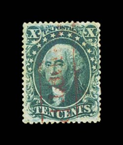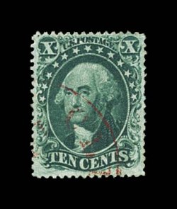 127 O 34 image#34, 10c Green, Ty. IV, pos. 54L, recut at bottom, quite well centered, with attractive color and impression, and possessing an unusual boxed red cancellation, very fine; 1996 PF certificate. (Image) $2,375.00