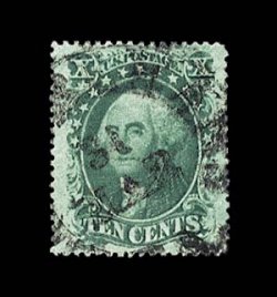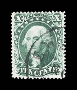 128 O 35 image#35, 10c Green, Ty. V, exceptionally well centered within incredibly wide margins, bright pretty color, c.d.s. town cancel, extremely fine and choice; 1979 PF certificate. (Image) $65.00