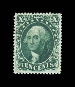 125 ng 33 image#33, 10c Green, Ty. III, a lovely unused example of this truly rare stamp, possessing an extraordinary overall freshness and crispness, with deep luxuriant color and a strong prooflike impression, uncommonly well centered, and boasting extra-large margins that are well clear of the design all around, plus full even perforations, extremely fine; a most desirable stamp; 1996 PF certificate. (Image) $2,400.00