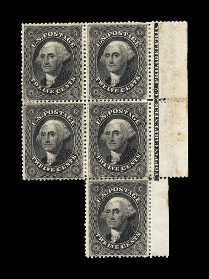 133 ogPB 36b image#36b, 12c Black, plate 3, an extremely rare right margin partial imprint and plate number "3" irregular block of five, the fifth stamp at bottom right having been removed and reattached to fill out imprint, all five stamps are quite well centered, particularly for this notoriously difficult stamp, deep luxuriant color and strong impression, nearly full o.g., top right stamp with small thin spot, overall very fine; a highly important perforated 1857 Twelve Cent imprint and plate number multiple; very few normal blocks of four from plate 3 are even known, and blocks containing either an imprint and/or plate number are almost non-existent, in fact, this multiple and a block of 42 containing a complete imprint and plate number are the only two such recorded multiples; ex-Chapin. (Image) Est. 5,000-7,500