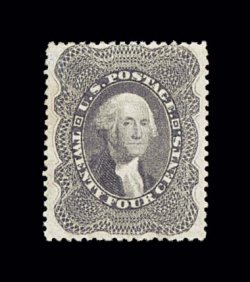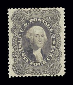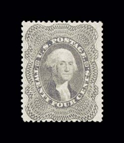 134 og 37 image#37, 24c Gray lilac, an exceptionally choice mint example, possessing near perfect centering amid unusually large margins with perforations clearing the design virtually all around, plus its color is far more intense and in a much deeper shade than typically encountered, full o.g., lightly hinged, extremely fine; a gem original gum example of this scarce mint stamp. (Image) $1,600.00