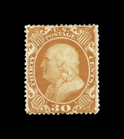 140 og 38 image#38, 30c Orange, an outstanding mint example that is not only extraordinarily well centered, but brilliantly fresh as well, gorgeous intense color in a deep shade, without any hint of oxidizing so often encountered on orange colored stamps, strong detailed impression on bright paper, full o.g., minor h.r., extremely fine; few original gum examples are as fresh and choice as this particular copy; ex-Chapin. (Image) $1,900.00