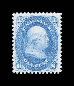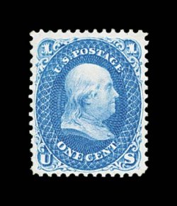 166 og 63 image#63, 1c Blue, a lovely mint single which possesses lavishly large margins all around which are almost never encountered on this value, plus outstanding centering within these impressive borders, gorgeous brilliant color in one of the lighter shades and a razor-sharp impression on bright crisp paper, full clean o.g., very lightly hinged, extremely fine; a highly desirable stamp with such expansive margins; 1991 PF certificate as a left sheet margin single, selvage removed but included. (Image) $325.00