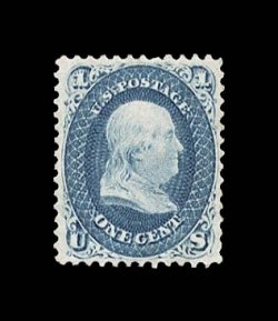 170 og 63b image#63b, 1c Dark blue, a gem mint example of this very scarce and distinctive shade variety, flawlessly centered within large margins, luxuriously rich color and a razor-sharp impression on fresh crisp paper, full clean o.g., lightly hinged, extremely fine; an elusive shade variety in any condition, let alone in this premium quality; 1989 PF certificate specifically identifying this as the dark blue shade; ex-Lessin and Chapin. (Image) $750.00