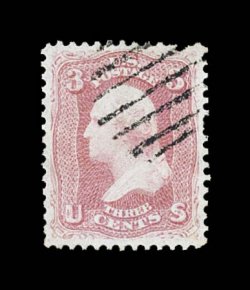173 O 64 image#64, 3c Pink, incredibly well centered within uncharacteristically large margins, lovely intense color that is unmistakably pink, strong impression as well on bright paper, in addition lightly cancelled with unobtrusive black grid, extremely fine; a lovely used gem example of the Three Cent Pink; 1980 and 1998 PF certificates. (Image) $850.00