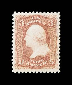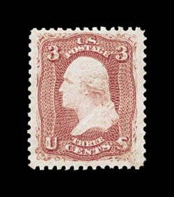 175 og 65 image#65, 3c Rose, incredibly choice mint single, boasting enormously large margins all around and being precisely centered within them, contributing further to this stamp's exceptional eye appeal is its incredible freshness, with unusually bright color and a razor-sharp impression on crisp paper, full o.g., lightly hinged, an extremely fine gem for the perfectionist; 1987 PF certificate. (Image) $130.00