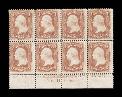 177 ogPB 65 image#65, 3c Rose, bottom margin imprint and plate "No. 11" block of eight, quite strong rose red color, centered just into the design at left, full o.g., hinge reinforced vertical perforations including some that are separated or crimped, very faint vertical creases affect the left block of four, fine appearance and a rare plate block; Chapin census #199 as a block of twelve from which this was taken; ex-Chapin. (Image) $4,250.00