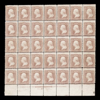178 ngPB 65 image#65, 3c Rose, impressive unused bottom imprint and plate "No. 37" block of 35 (7x5), uniform dull red color, centered into the design at bottom, removal of the gum has preserved the integrity of this large multiple keeping it remarkably intact with only a very few separated perforations, couple of small spots, only one of which affects a stamp, otherwise quite sound and fine; rare with only six plate blocks of plate 37 recorded; Chapin census #224; ex-Chapin. (Image) Est. 3,000-4,000