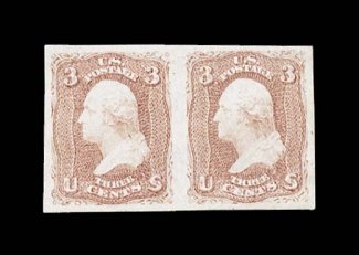 179 og 65c image#65c, 3c Rose imperforate, horizontal pair, uniformly large margins all around, quite fresh, rich color, full clean o.g., lightly hinged, extremely fine; a choice example of this very scarce imperforate pair that is often confused with the less valuable imperforate essay on sensitive ink paper; 1977 PF certificate; ex-Chapin. (Image) $1,000.00