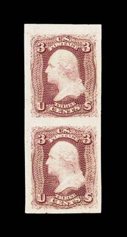 180 og 66a image#66a, 3c Lake, imperforate, gem vertical pair, boasting huge margins all around, including a partial sheet margin at top, rich color and a well incised impression, full o.g., lightly hinged, extremely fine; a most elusive imperforate pair; 1973 PF certificate; ex-Chapin. (Image) $1,850.00