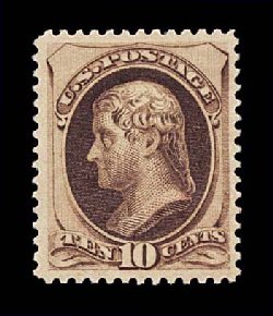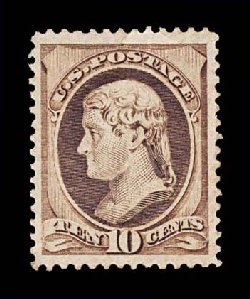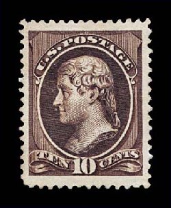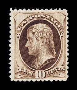 194 og 209b image#209b, 10c Black brown, an incomparable mint example of this very rare and distinctive Scott listed shade variety, possessing the most immense margins imaginable for any stamp, let alone this elusive variety, flawlessly centered amid this vast expanse, gorgeous intense and unmistakable black brown color, plus its impression could not be more deeply etched on bright paper, large part o.g., extremely fine; an amazing condition rarity; 1994 PSE certificate. (Image) $1,900.00