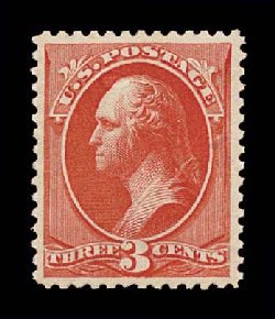 200 nh 214 image#214, 3c Vermilion, a gem mint single that would please even the most fastidious collector, being incredibly well centered amid large margins, plus its color could not be more vivid and intense on immaculate paper, pristine o.g., never hinged, extremely fine; a very pretty stamp; 1996 and 1997 PF certificates. (Image) $200.00