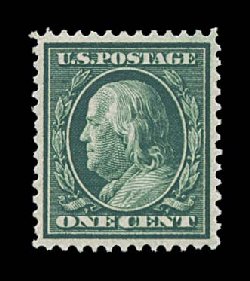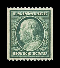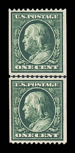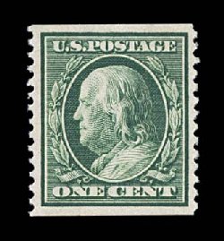 308 nh 352 image#352, 1c Green coil, perf. 12 vert., gem mint single, extraordinarily well centered and margined, deep rich color and a prooflike impression on immaculate paper, pristine o.g., n.h., extremely fine; genuine examples of this coil are actually quite elusive, particularly so in this premium condition; 1991 PF certificate for a pair, this being the right stamp. (Image) $200.00