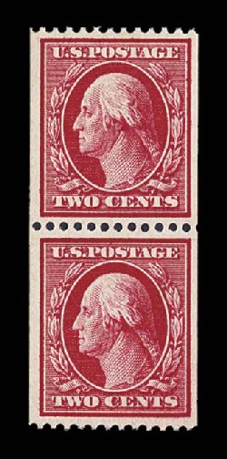 303 og/nh 349 image#349, 2c Carmine coil, perf. 12 horiz., pair, exceptionally bright and crisp, intense color and impression, marvelously well centered, o.g., top stamp very lightly hinged, bottom stamp n.h., extremely fine; 1988 PF certificate. (Image) $255.00