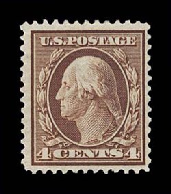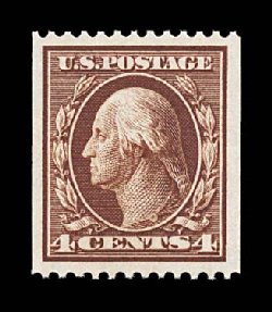 304 nh 350 image#350, 4c Orange brown coil, perf. 12 horiz., a magnificent quality mint single of this coil, being in a quality that would be almost impossible to duplicate, boasting enormously large margins (including at top and bottom which is not often seen) and flawlessly centered within them, fabulously bright and fresh, prooflike color and impression on immaculate paper, pristine o.g., n.h., an extremely fine gem in every regard; certified coil singles in this remarkable condition are true rarities; 2001 PF certificate. (Image) $350.00