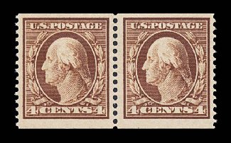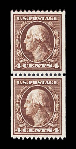 312 og 354 image#354, 4c Orange brown coil, perf. 12 vert., pair, 3mm spacing, well centered within extravagantly large margins not often seen on this coil, rich color, o.g., very lightly hinged, very fine and choice. (Image) $525.00