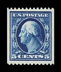 306 og 351 image#351, 5c Blue coil, perf. 12 horiz., an impressively margined mint single, featuring huge margins for this coil and being incredibly well centered within them, deep prooflike color and impression on brilliantly fresh paper, o.g., l.h., extremely fine; an eye-arresting gem; 1999 PF certificate. (Image) $175.00