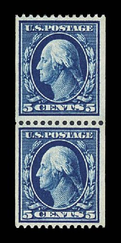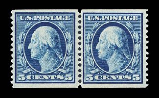 313 og 355 image#355, 5c Blue coil, perf. 12 vert., pair, especially fresh, truly prooflike color and impression, well centered, o.g., lightly hinged, extremely fine; 1981 PF certificate. (Image) $575.00