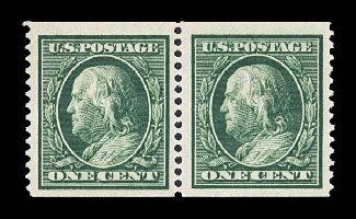 309 og/nh 352 image#352, 1c Green coil, perf. 12 vert., pair, 3mm spacing, wonderfully well centered amid gigantic margins for any perf. 12 coil, let alone this elusive and often faked value, gorgeous color and impression which contrasts well with its bright white paper, o.g., right stamp with barest trace of hinging, left stamp n.h., extremely fine; 1986 PF certificate. (Image) $295.00