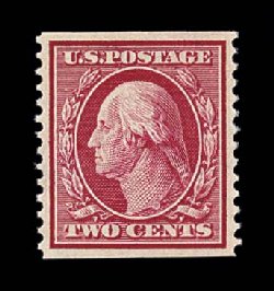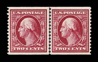 311 og 353 image#353, 2c Carmine coil, perf. 12 vert., highly select guide line pair, exceptionally well centered within uncharacteristically large margins, deep "fiery" color and a well incised impression, o.g., faintest trace of a hinge mark, extremely fine; a surprisingly scarce and elusive line pair in such outstanding quality; 1980 PF and 2001 PSE certificates; ex-Floyd. (Image) $750.00
